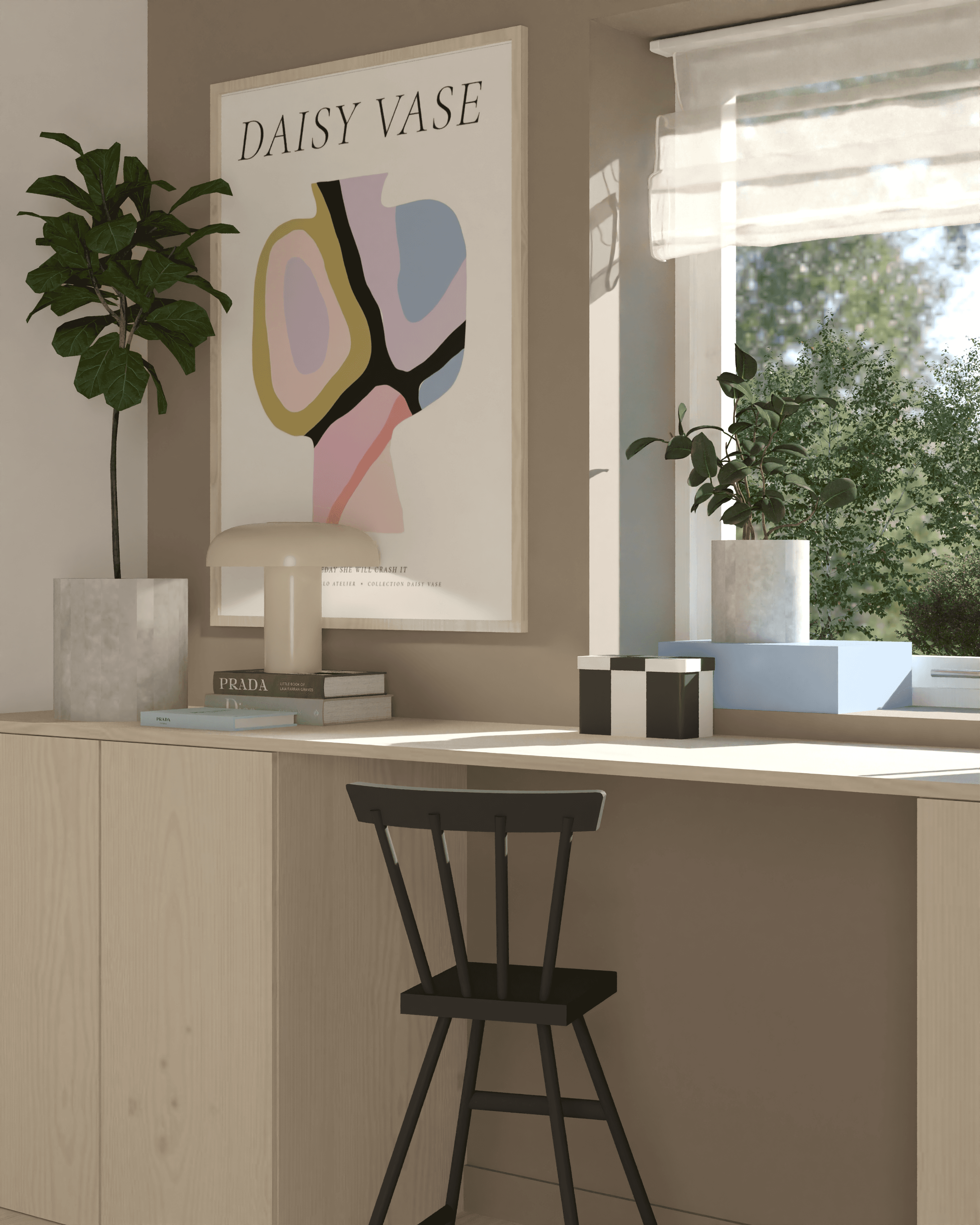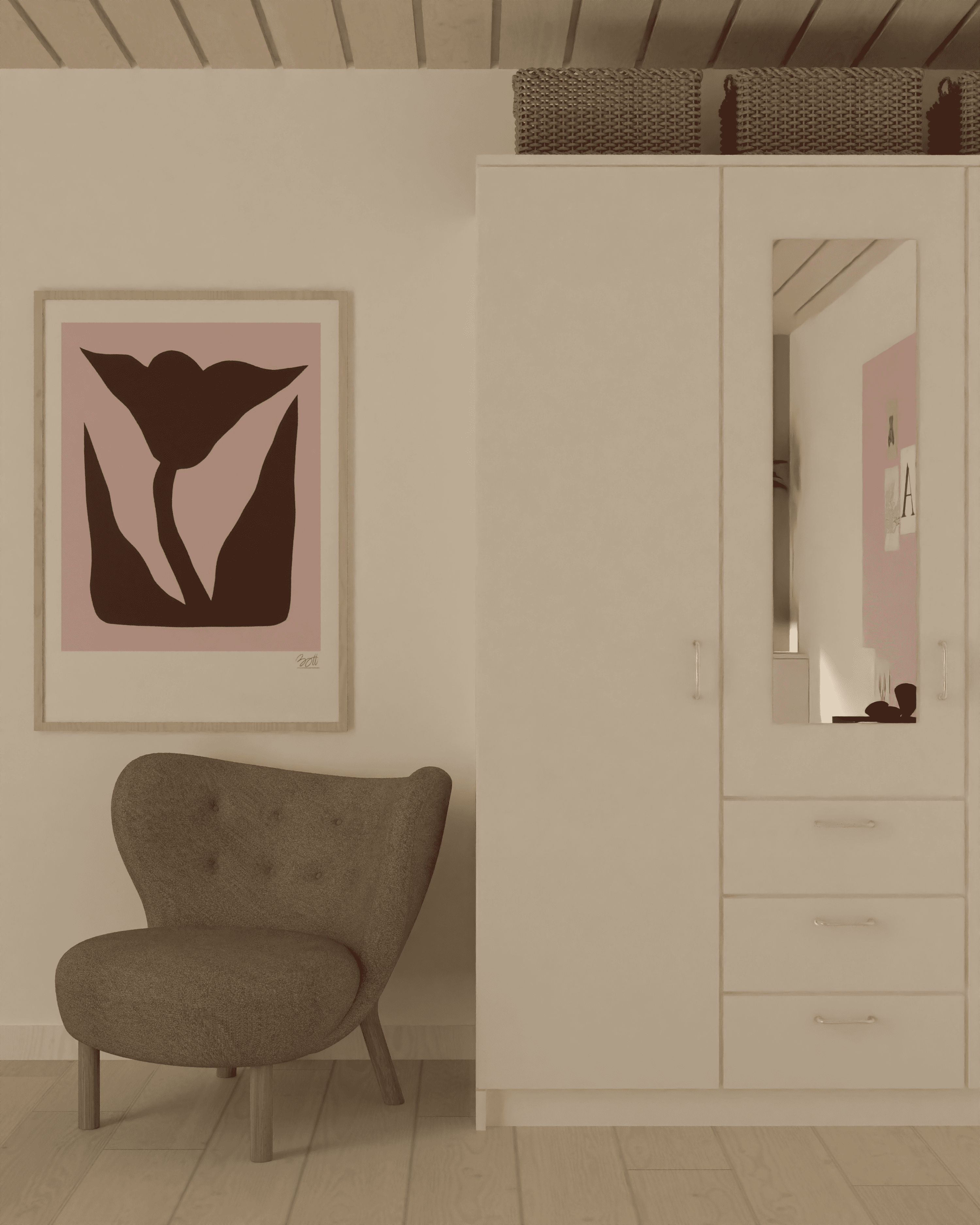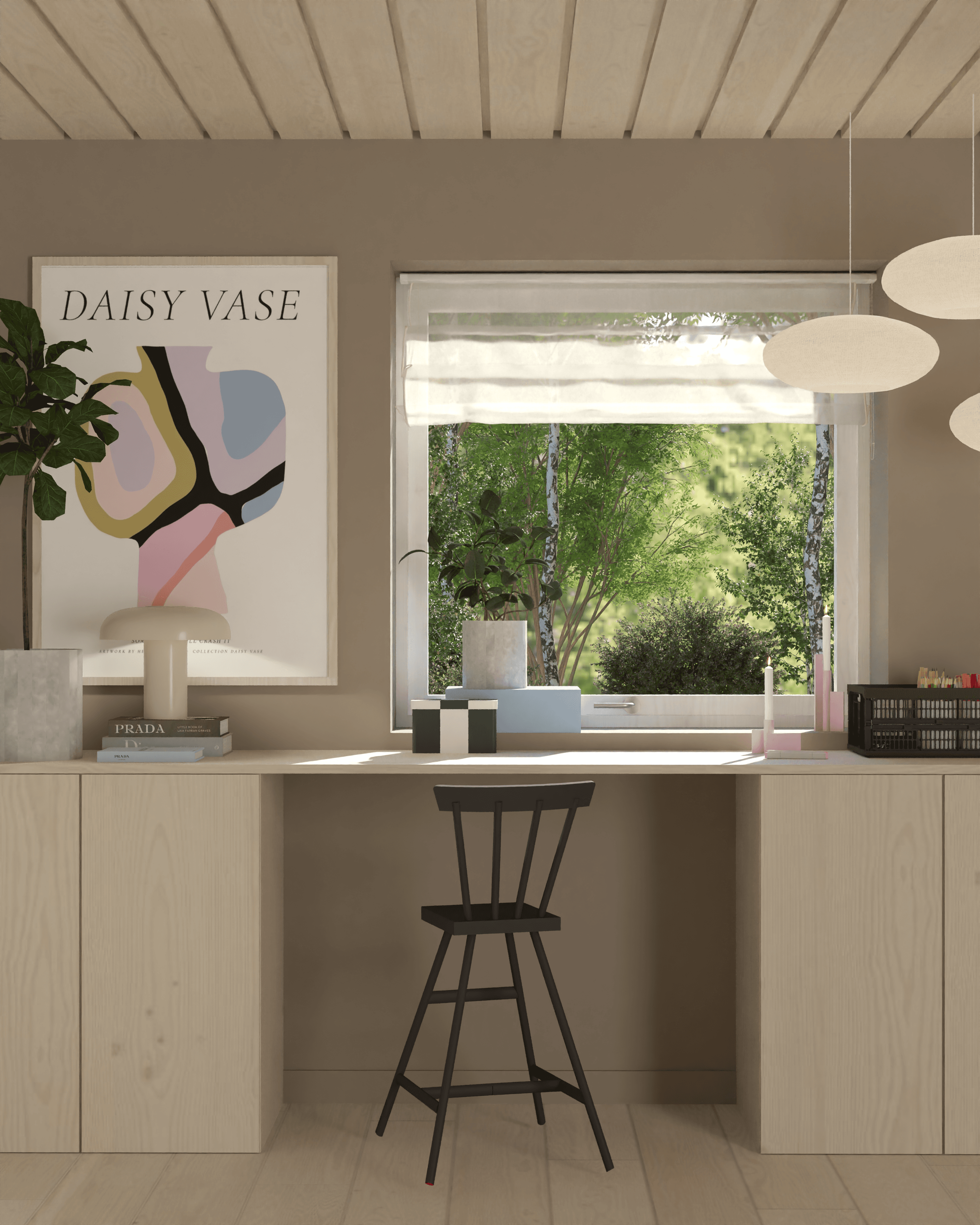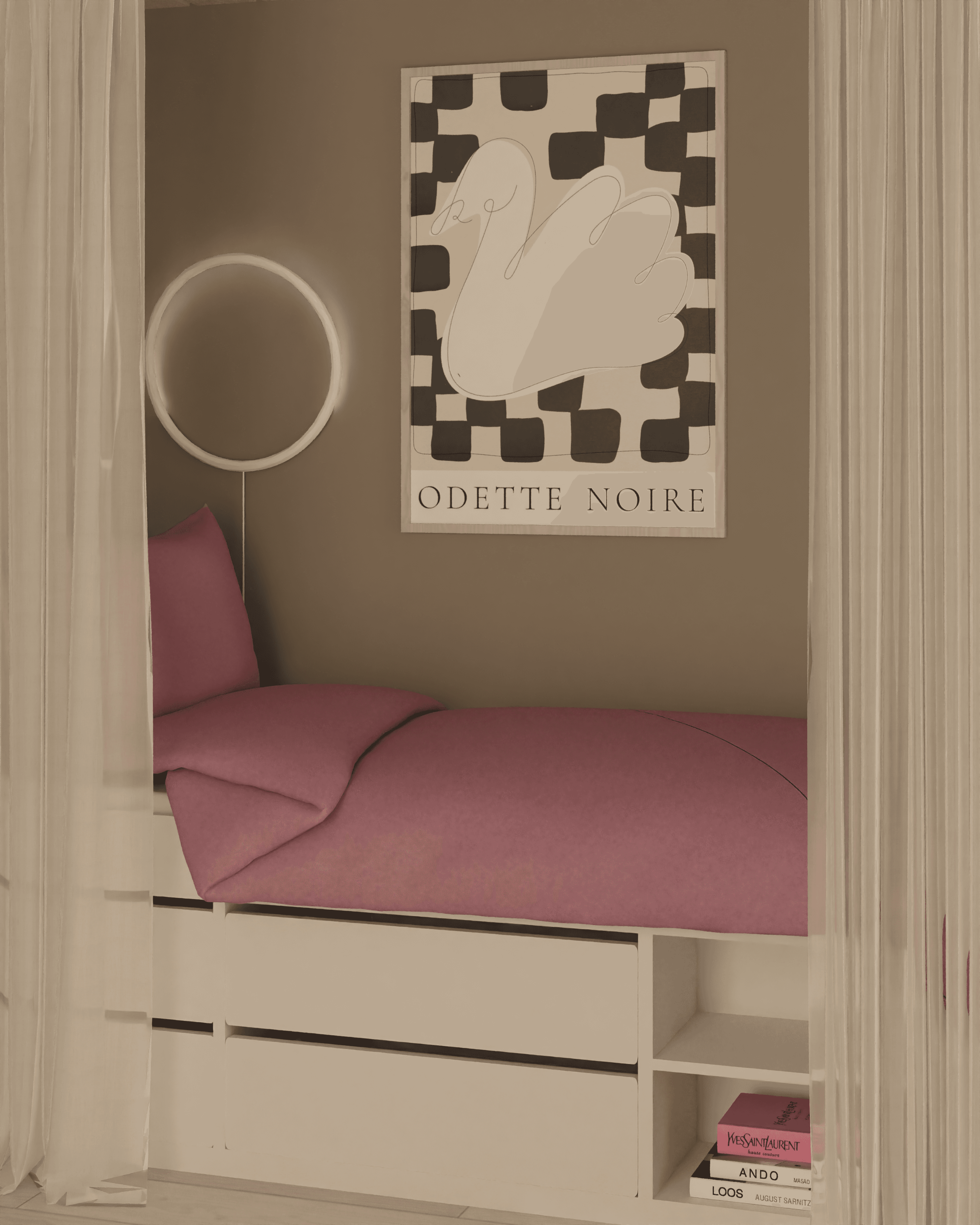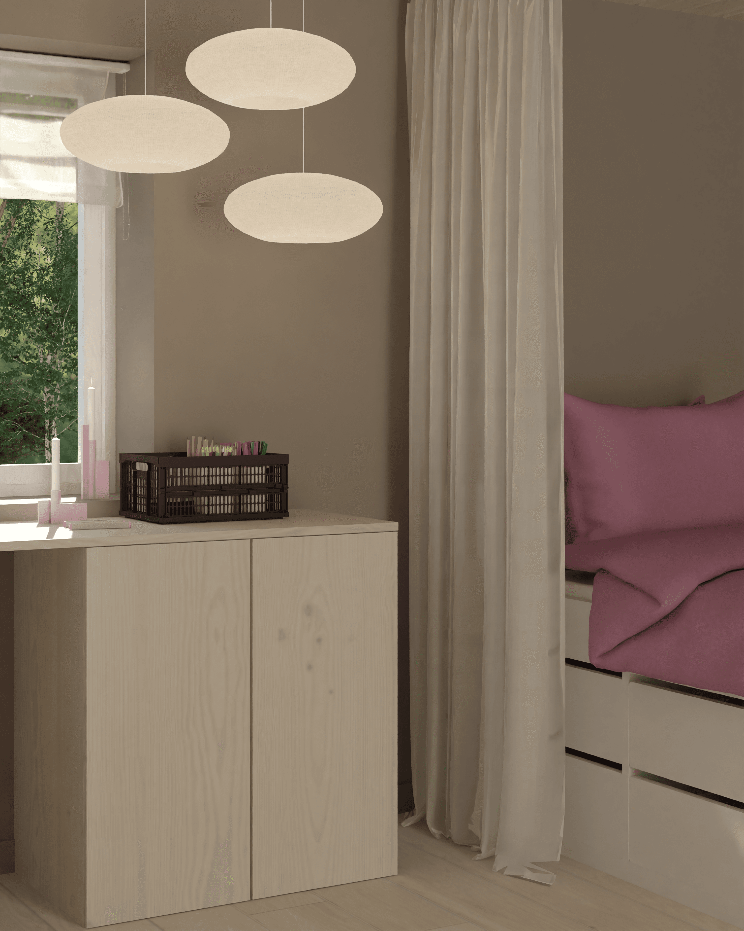Pigeværelset er skabt som et harmonisk univers, hvor funktionalitet og personlighed mødes. Her er der tænkt på at give plads til både kreativitet, leg og organisering, så rummet indbyder til hverdagens aktiviteter og samtidig føles som hendes helt eget sted. På væggene er der udvalgt plakater i den lyserøde farvepalette, som tilfører et grafisk udtryk og binder indretningen sammen æstetisk. To af væggene er malet i farven Jeton Mohair, der skaber en blød kontrast til de lyse flader. Den brun beige tone virker rolig og dæmpende, og tilfører rummet en varm, indbydende stemning med balance og dybde. Ved det brede skrivebord er der god plads til både lektier og kreative aktiviteter, mens opbevaringsløsninger sikrer, at tegnegrej og andre materialer let kan holdes organiseret. Bordets størrelse giver samtidig mulighed for hyggelige stunder med veninderne. Ydermere er der en stor DIY-opslagstavle beklædt med lyserødt linen, hvor man kan udstille sine tegninger og andre personlige ting. En lille krog foran spejlet danner et personligt område, hvor man kan smukkesere sig og have sit eget private hjørne.