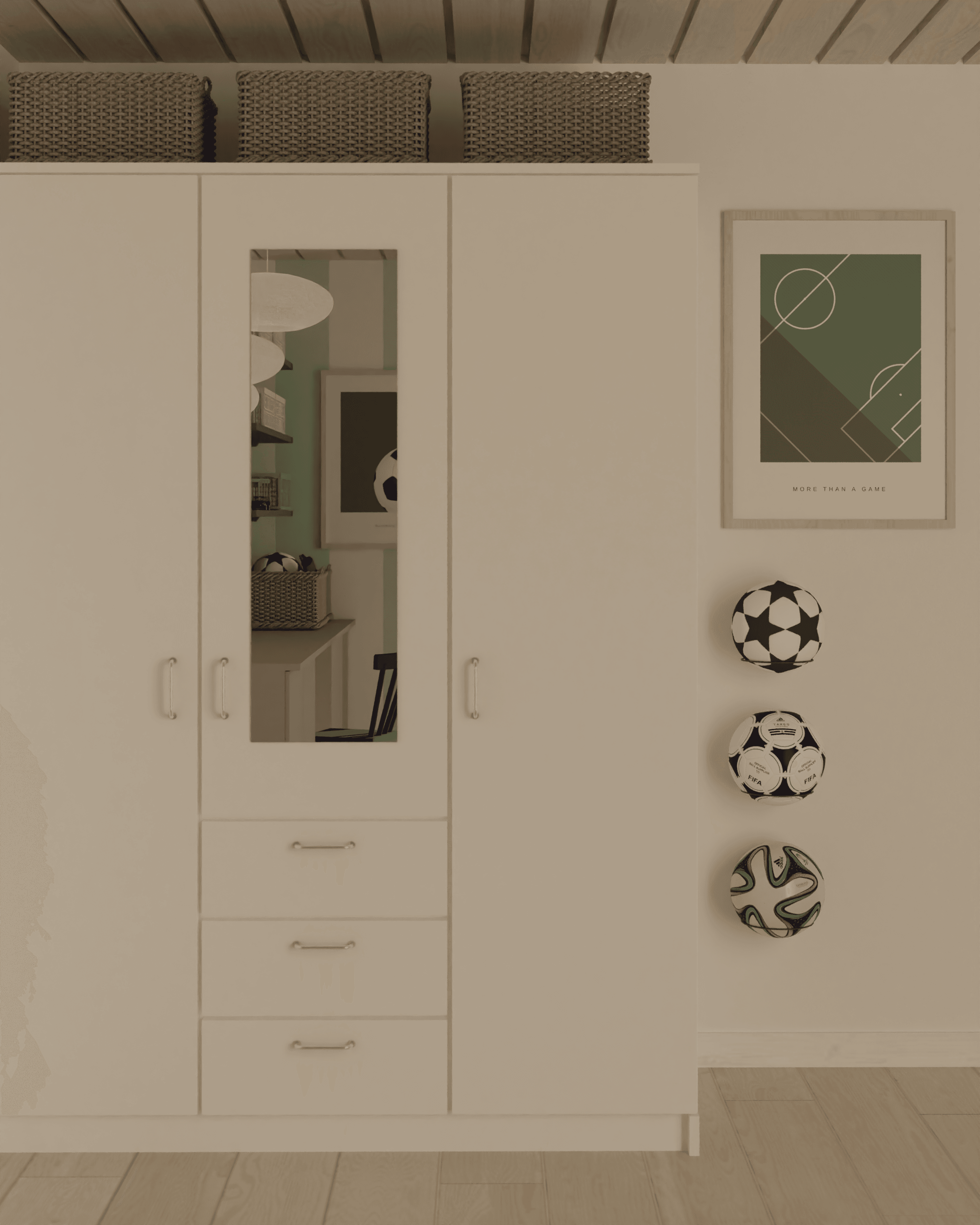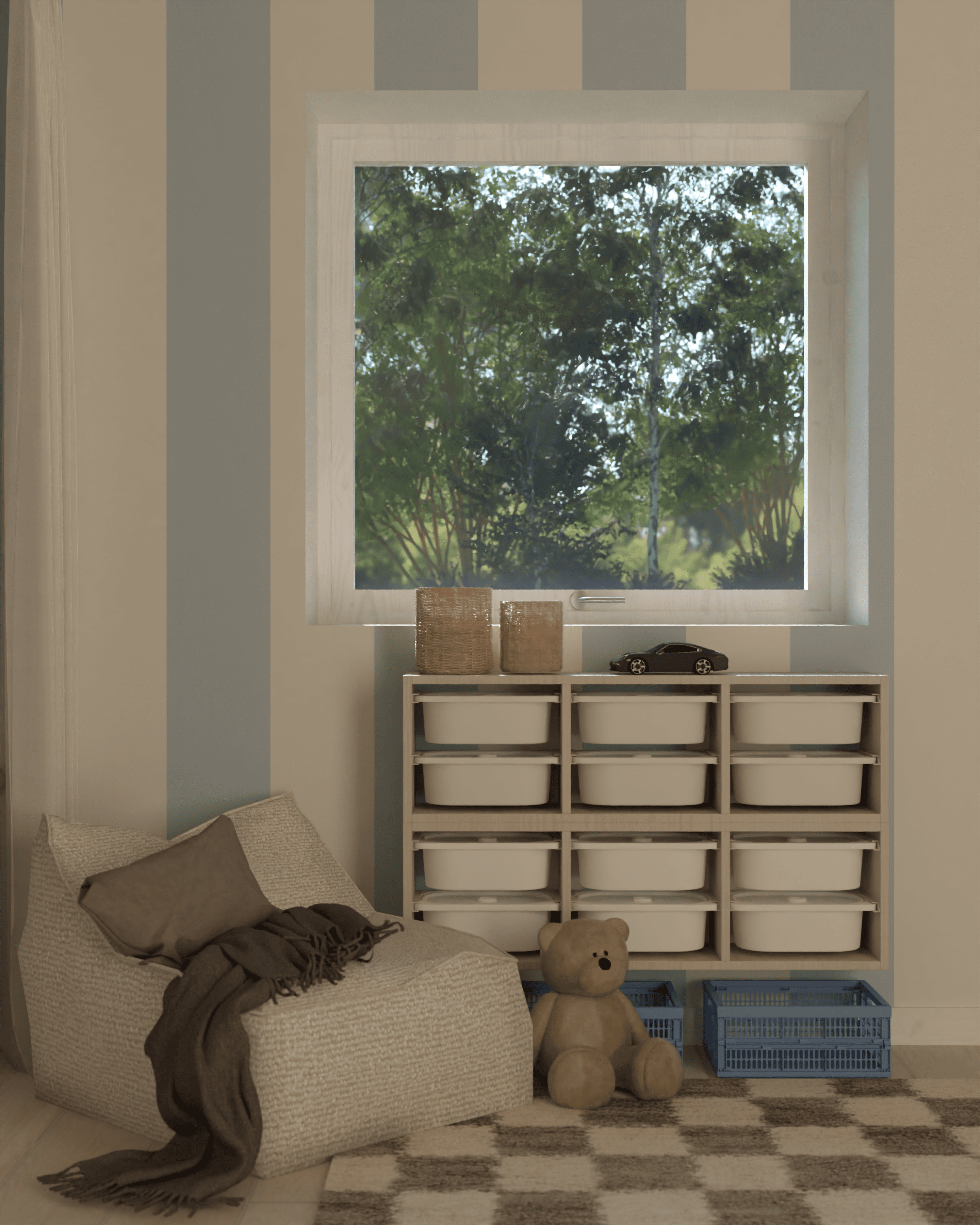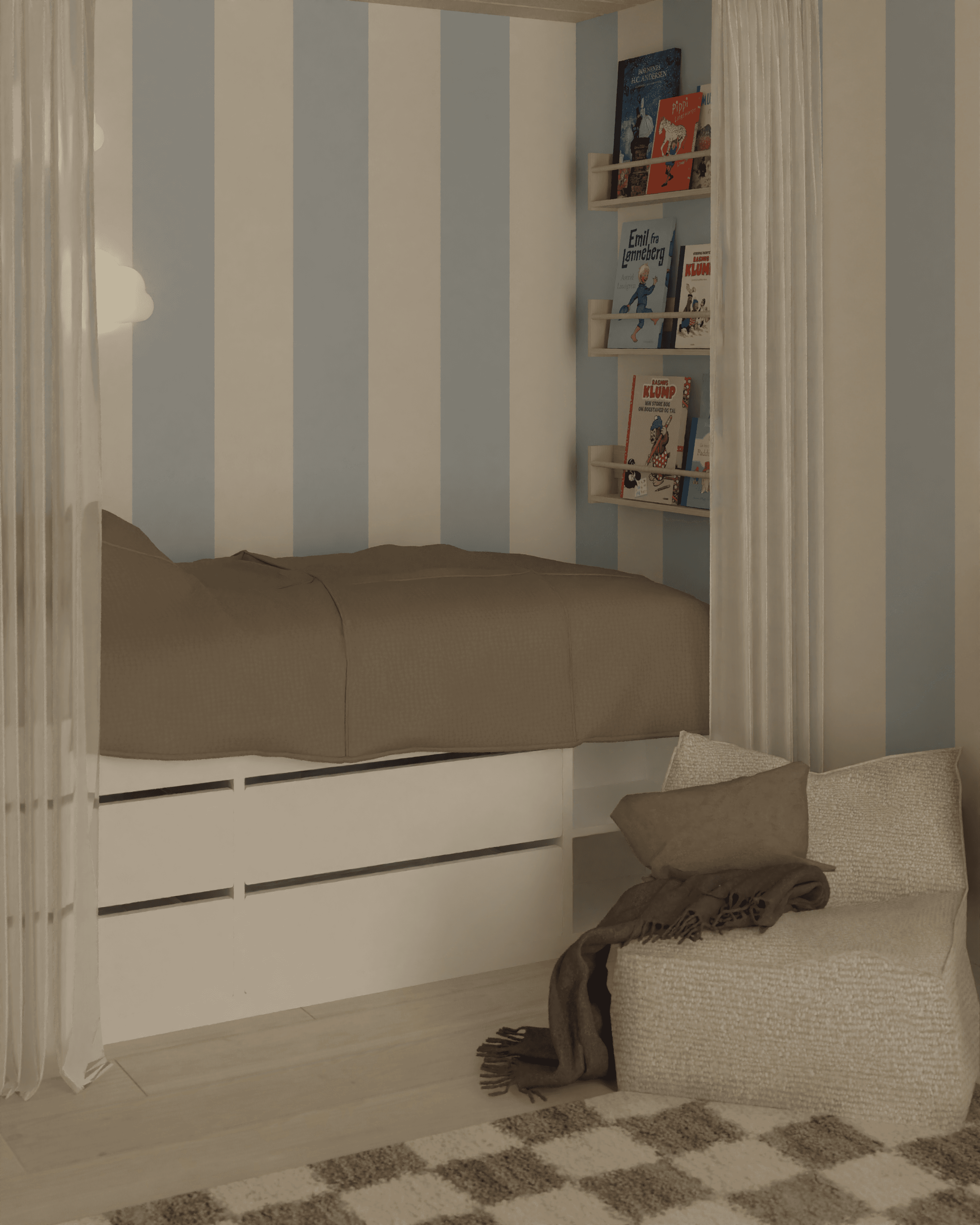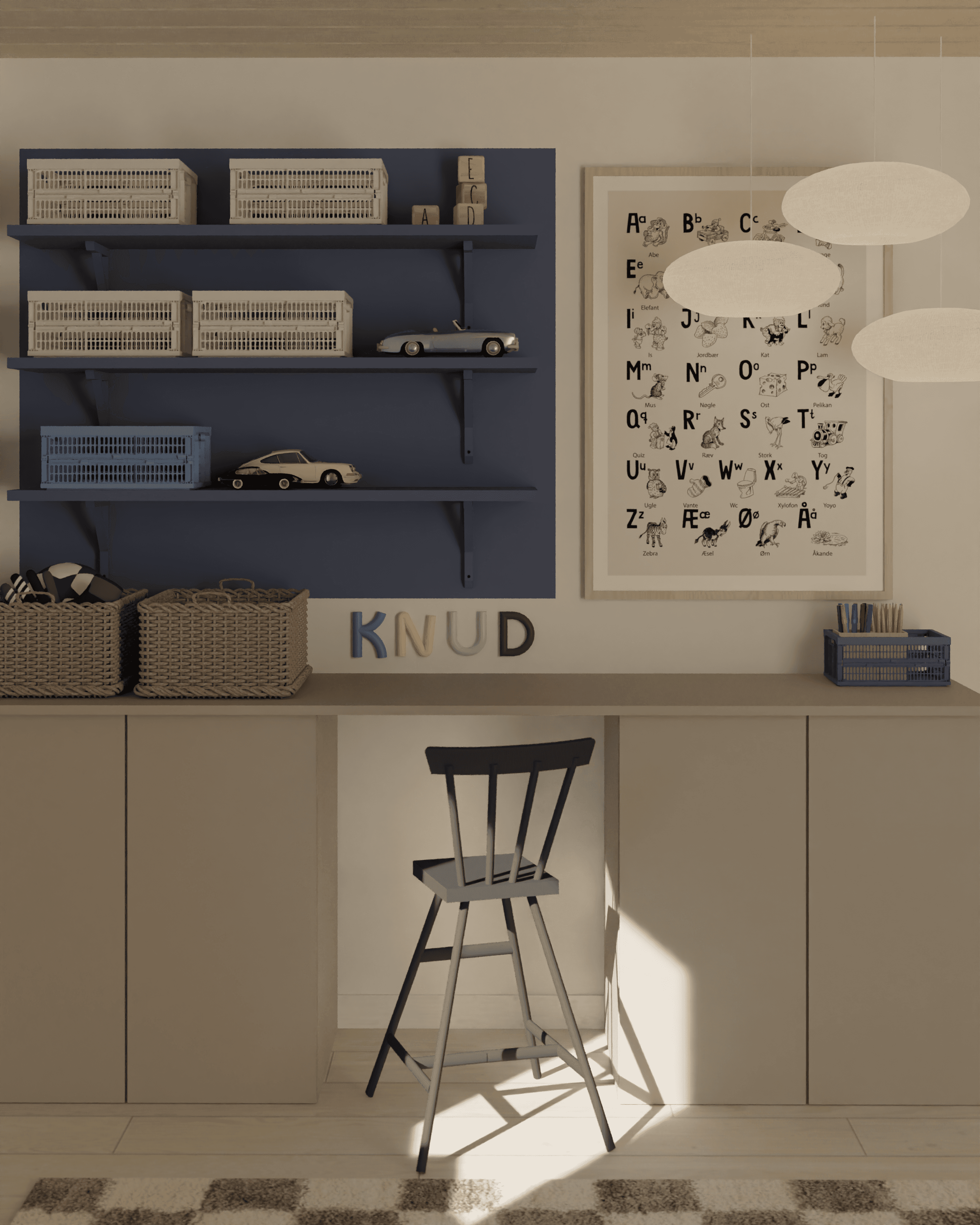 Indretningen af et drengeværelse er skabt med fokus på leg, udfoldelse og funktionelle løsninger, der giver plads til både aktivitet og ro. Ved skrivebordet er der integreret IVAR skabe under bordpladen, som giver god opbevaringsplads og holder rummet organiseret. Over skrivebordet er der placeret tre hylder, hvor Knud kan udstille sine biler og opbevare ting. Hylderne er indrammet af en blåmalet firkant, der skaber struktur og fremhæver opbevaringsområdet. Til de mere afslappede stunder er der indrettet en hyggekrog med en stor sækkepude, hvor man kan trække sig tilbage og nyde en rolig stund. Under vinduet er der placeret TROFAST-reoler, der gør det nemt at finde legetøjet frem – og lige så hurtigt pakke det væk igen, når legen er slut. For at tilføre værelset karakter er en væg dekoreret med striber, som giver et roligt og harmonisk udtryk. Fodboldplakater tilfører personlighed og skaber en spændende kontrast til de lyseblå og beige nuancer, der præger rummet. Rundt om sengen er der monteret.