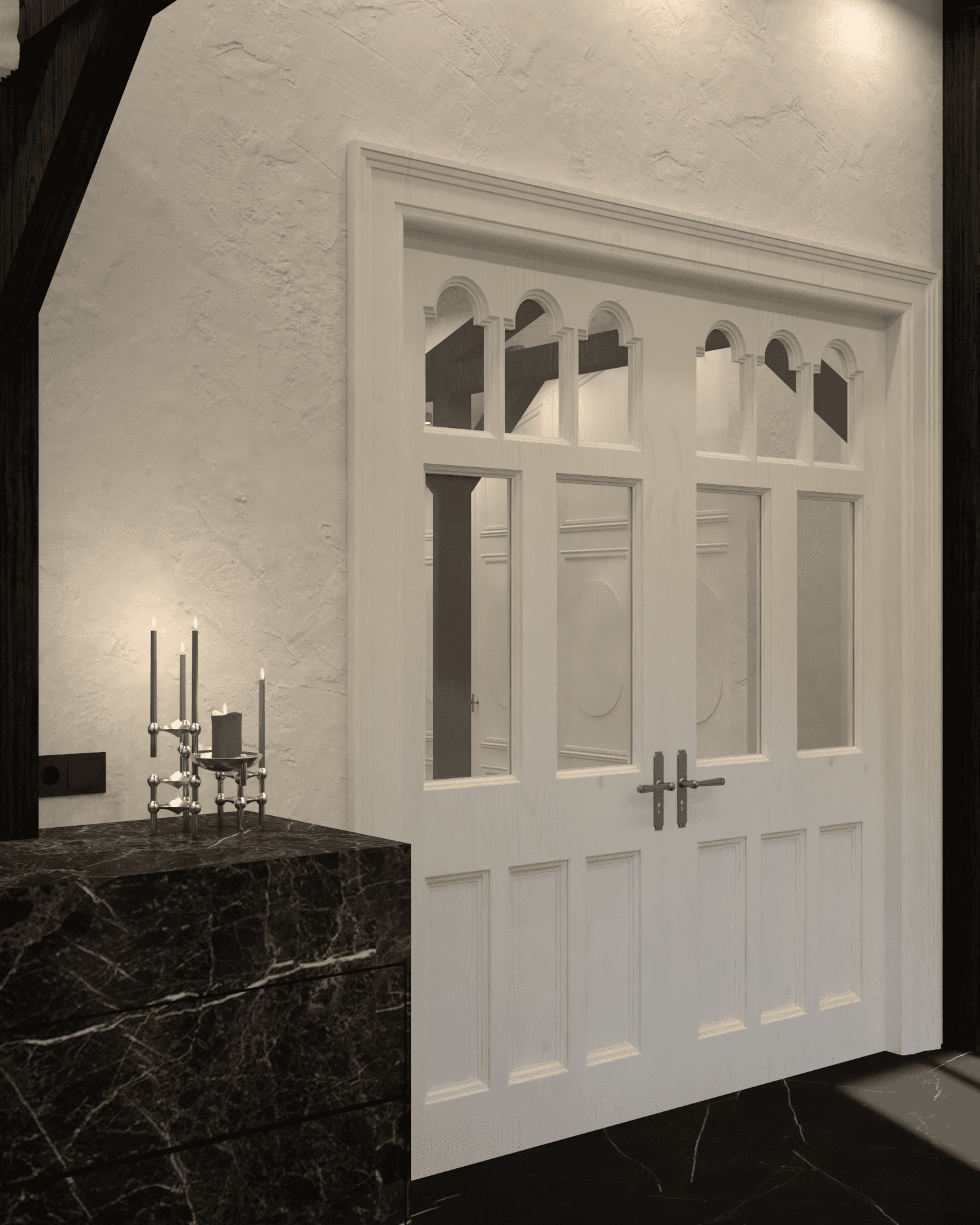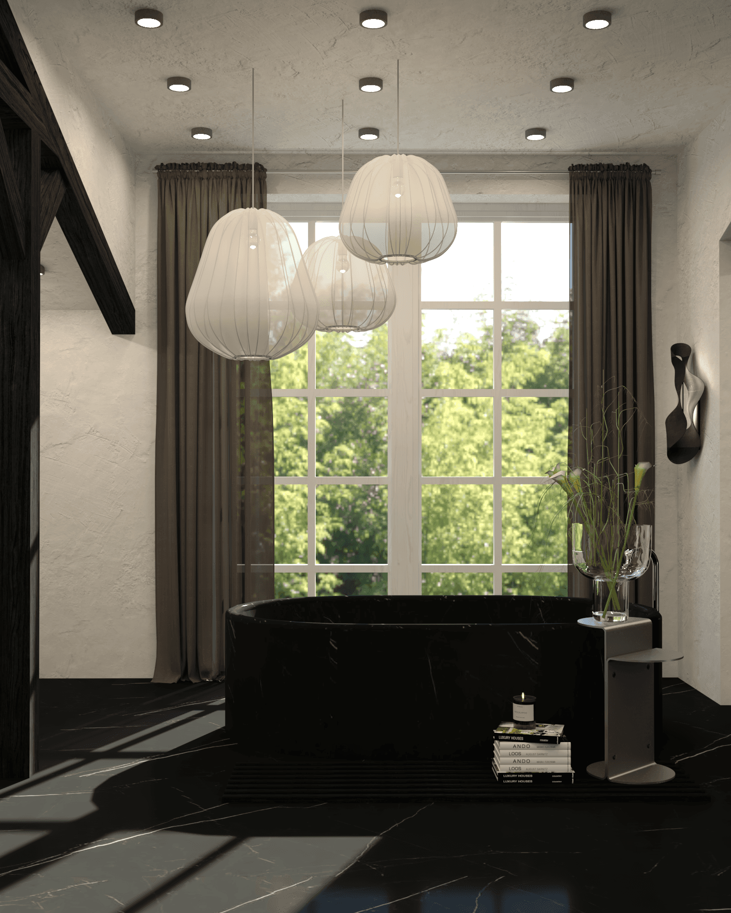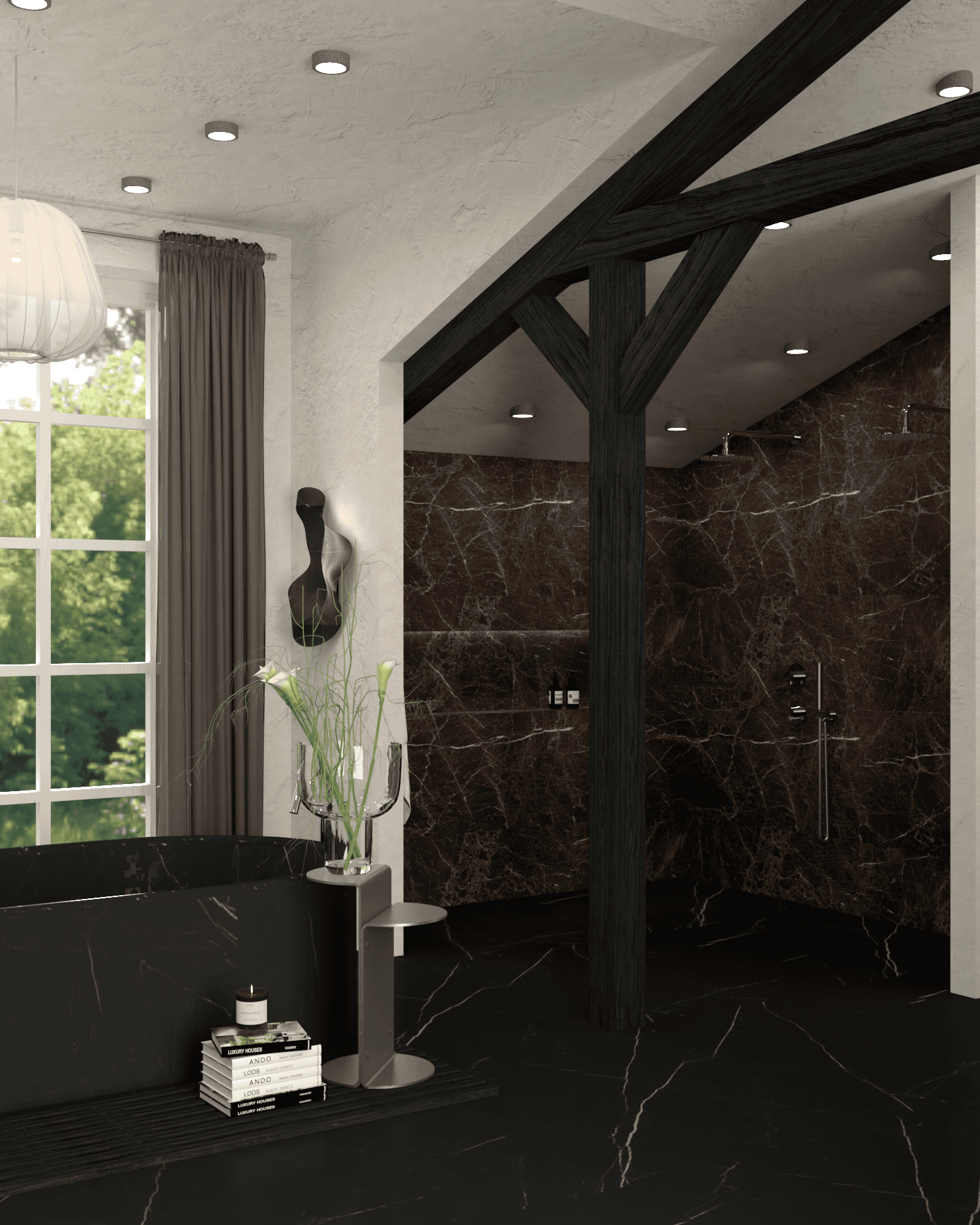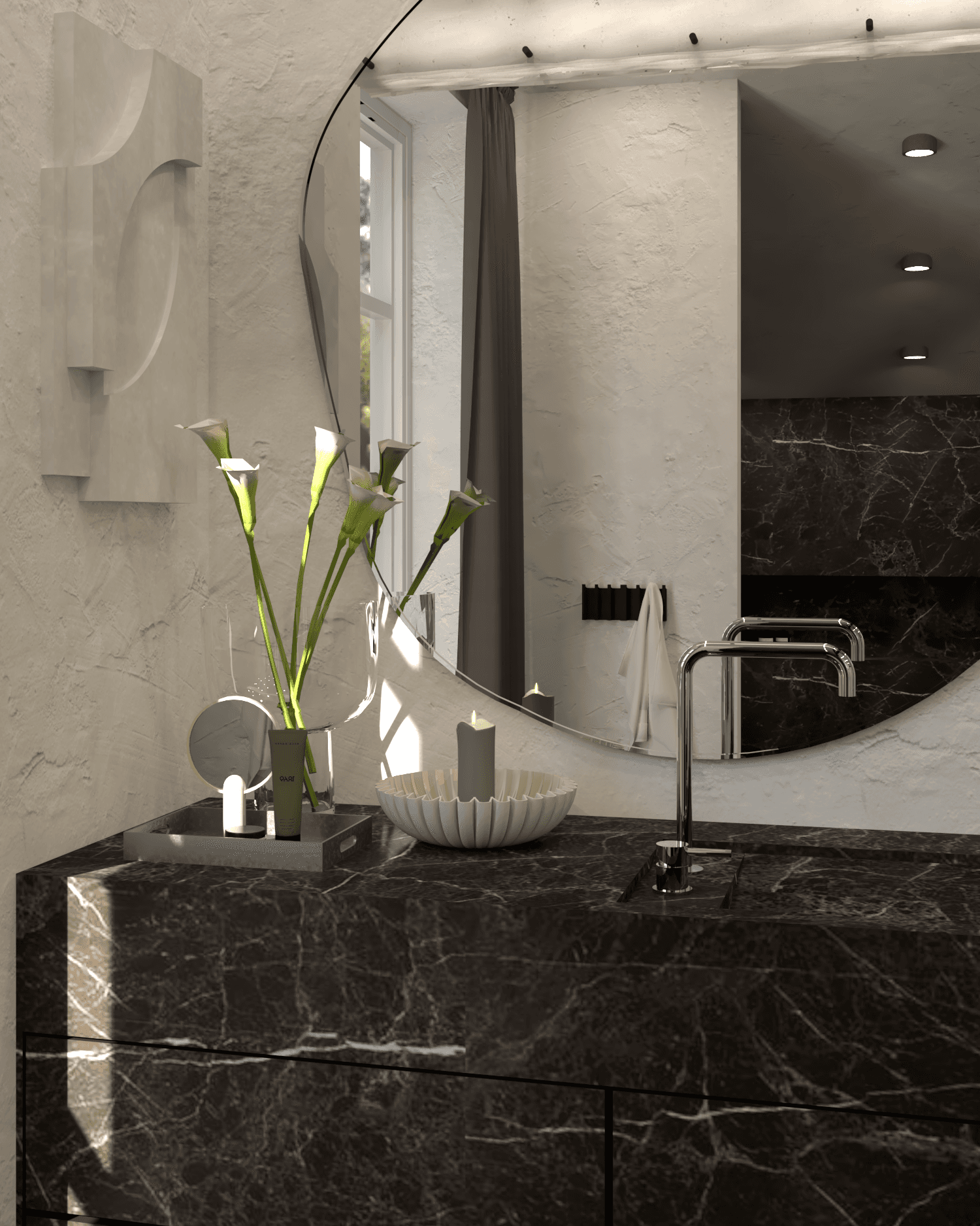 Dette badeværelsedesign kombinerer varme naturtoner med eksklusivitet og sofistikeret elegance. Badeværelsesmøblet er udført i brune naturstensklinker, hvis naturlige strukturer tilfører dybde og taktil finesse, mens lysere elementer balancerer helheden. Sort marmor tilfører dybde og et eksklusivt præg, og hvide detaljer lyser rummet op og fremhæver de luksuriøse materialer. Kombinationen af de brune nuancer og mørk marmor skaber en rolig, organisk stemning, mens den samlede atmosfære er designet til at give en spa-lignende oplevelse i hjemmets private rammer.