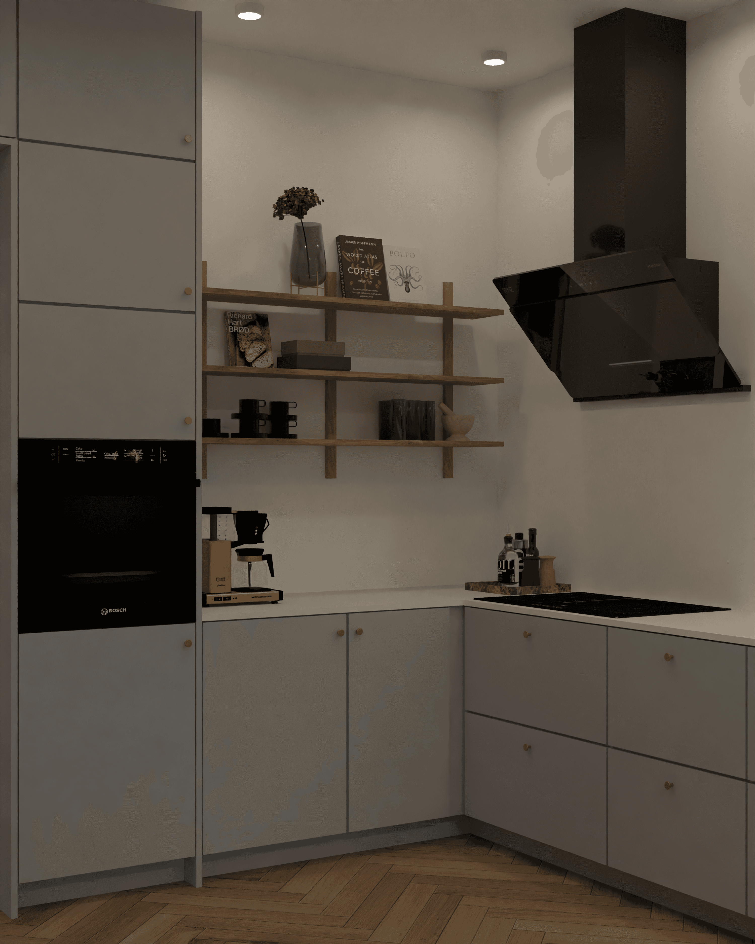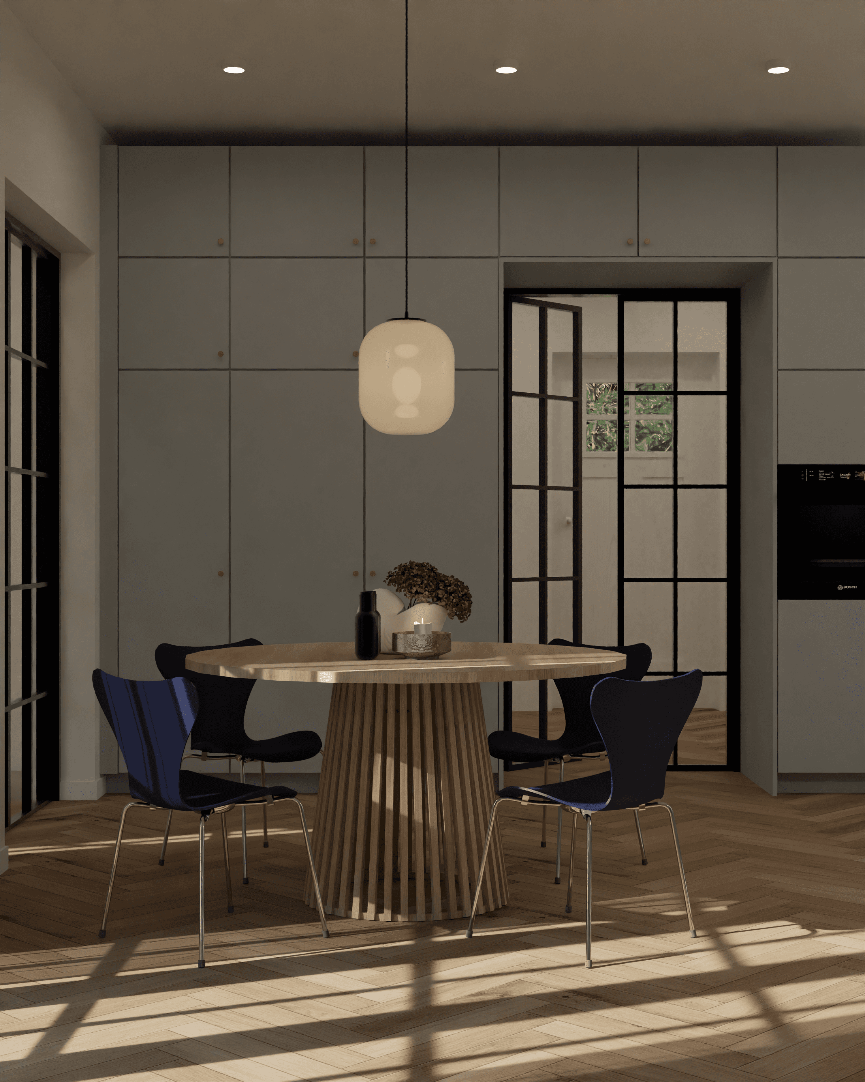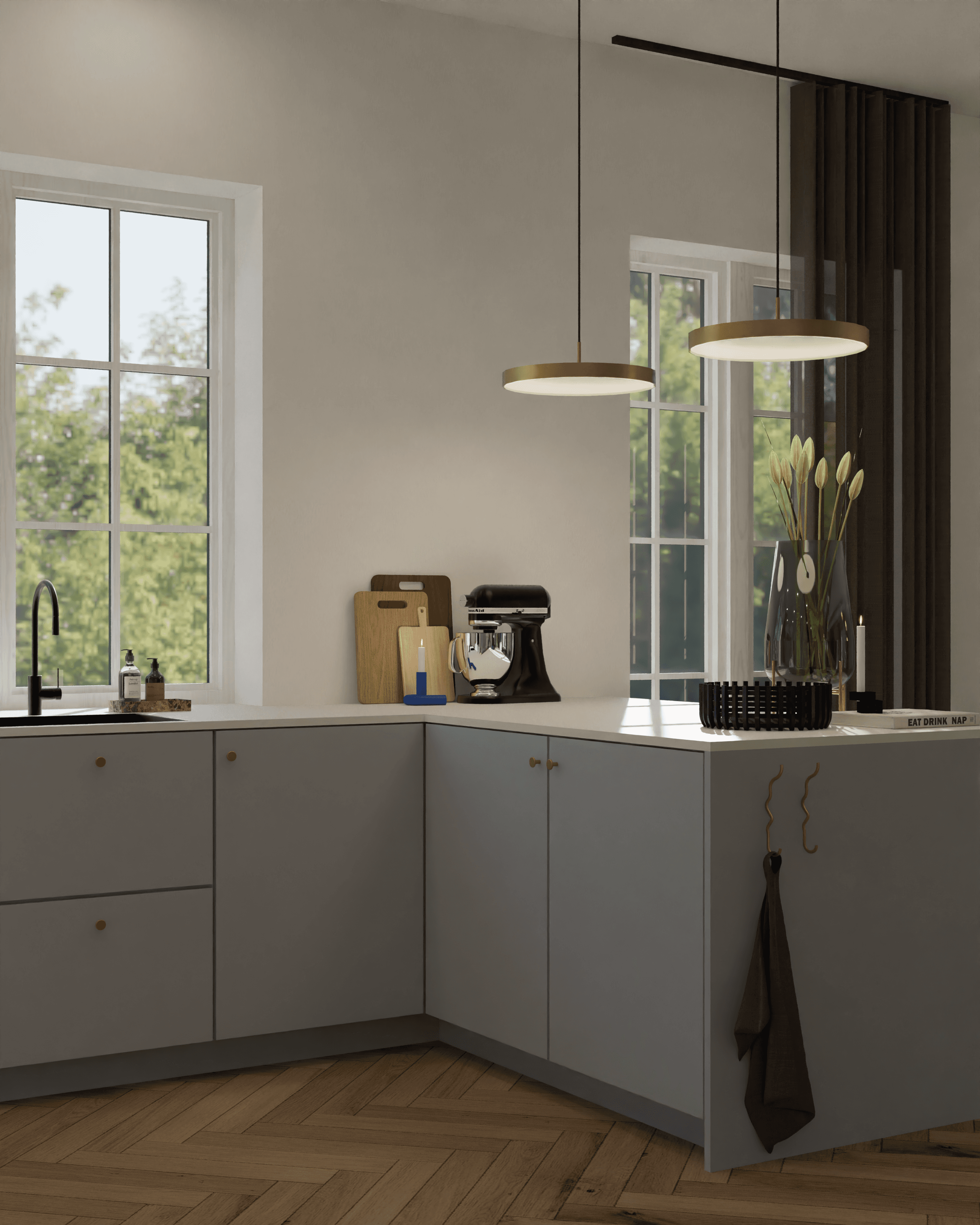Indretningen sikrer samtidig plads til børnene med fri områder til leg og bevægelse, uden at funktionaliteten i rummet kompromitteres. Eksisterende møbler er integreret, så rummets karakter bevares, samtidig med at løsningen bliver moderne og funktionel. Helheden understøtter både samvær omkring køkkenet, ophold i stuen og fleksibel brug af rummet i hverdagen.