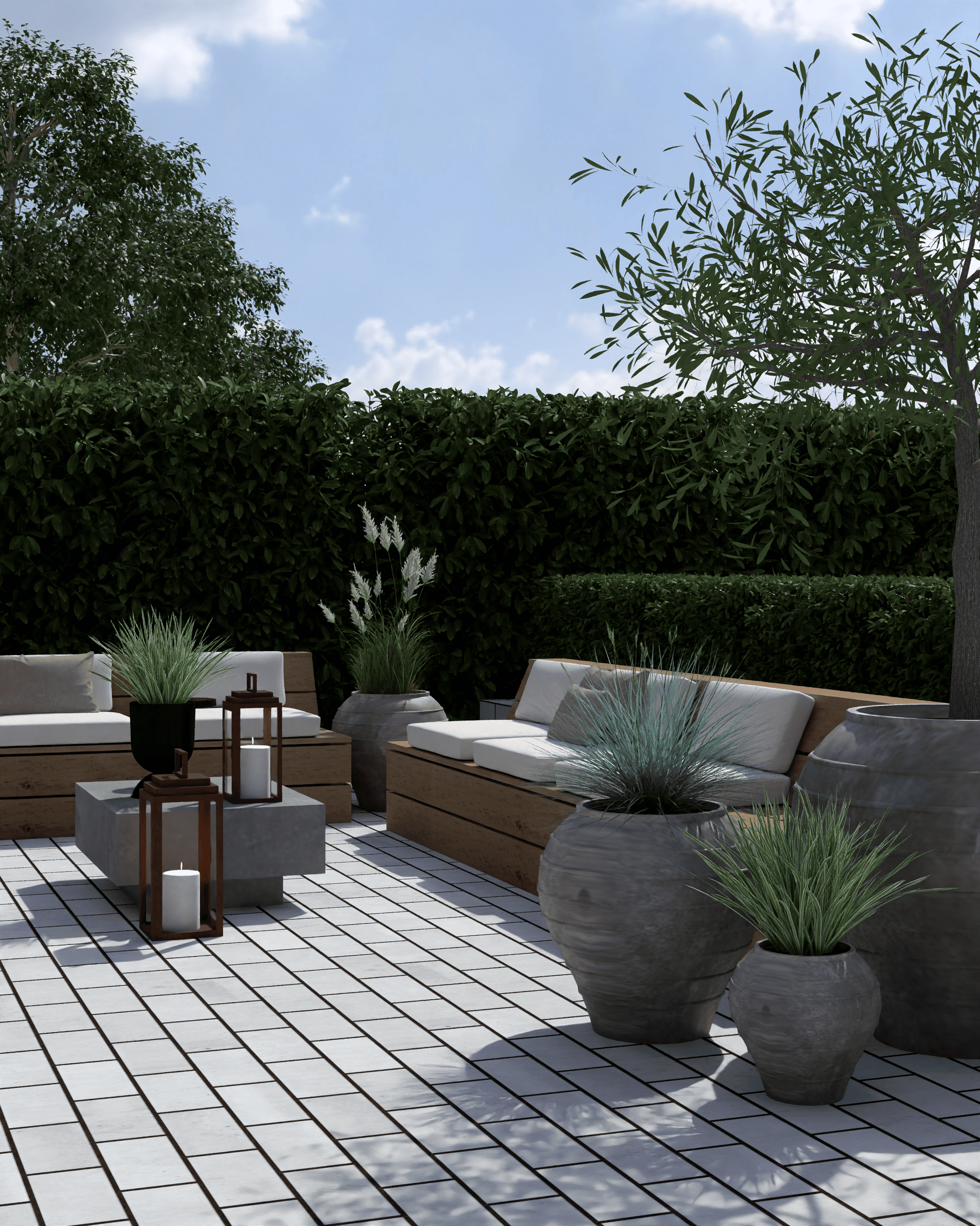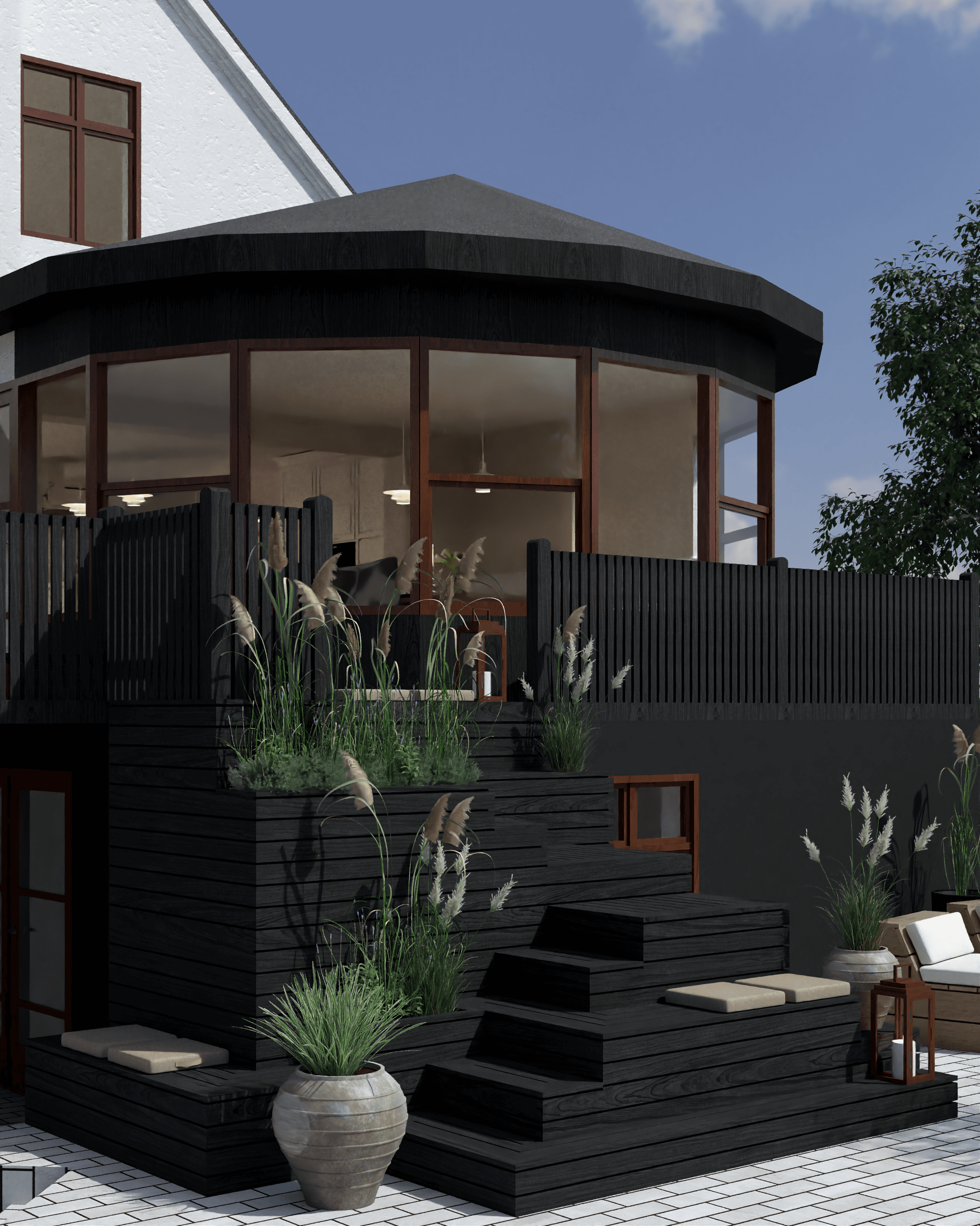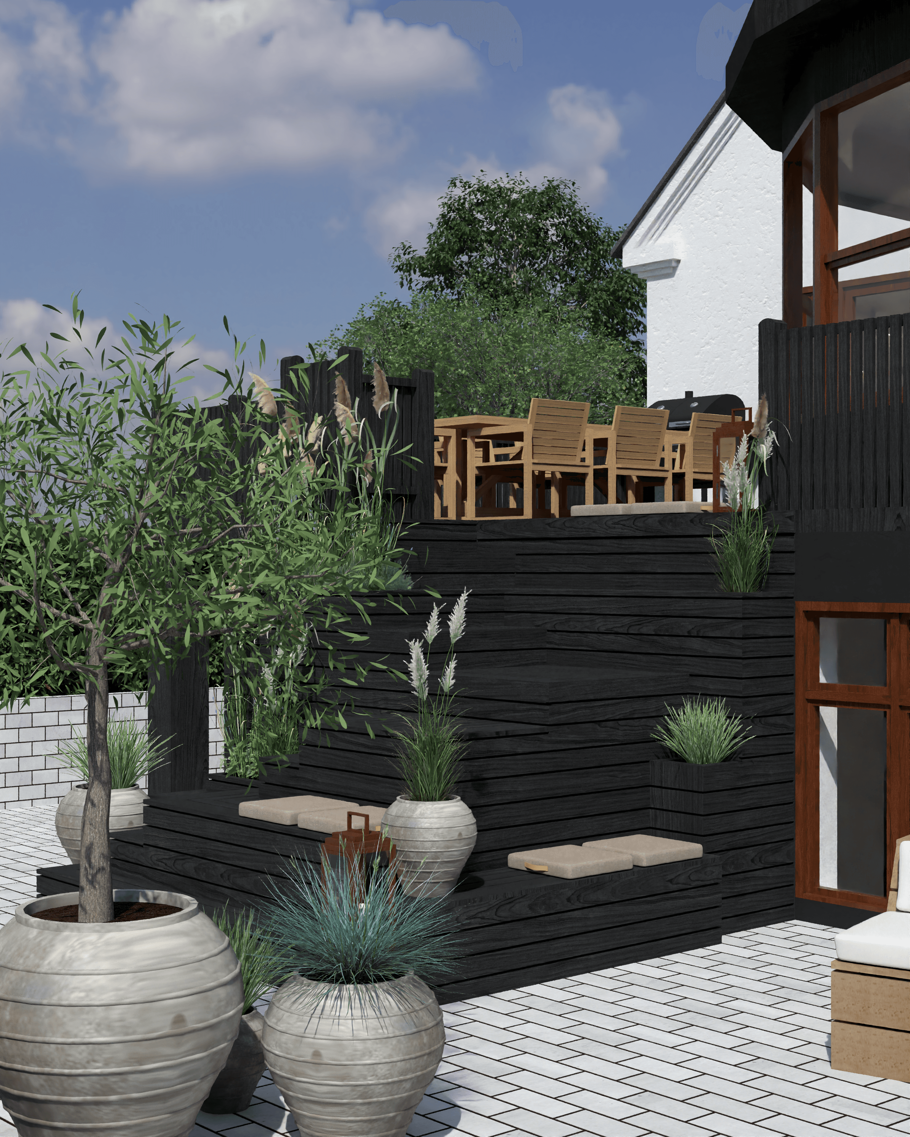 For at forbinde de to terrasser er der designet en trappe i sort olieret træ, som både harmonerer med husets hvide facade og sorte sokkel, samtidig med at den fungerer som opholdssted, hvor man kan nyde udsigten over haven og det bagvedliggende naturområde. Trappen har integreret plads til planter, der tilfører liv, og området under trinene kan bruges til opbevaring af hynder eller udstyr. På den anden terrasse er der skabt et loungeområde med komfortable loungemøbler i olieret træ, der inviterer til afslapning og samvær. Planterne rundt om terrassen tilfører grønne elementer, som skaber en behagelig og indbydende stemning. Helheden kombinerer funktionalitet, komfort og æstetik, og giver mulighed for både hyggelige måltider og afslappende stunder i det fri.